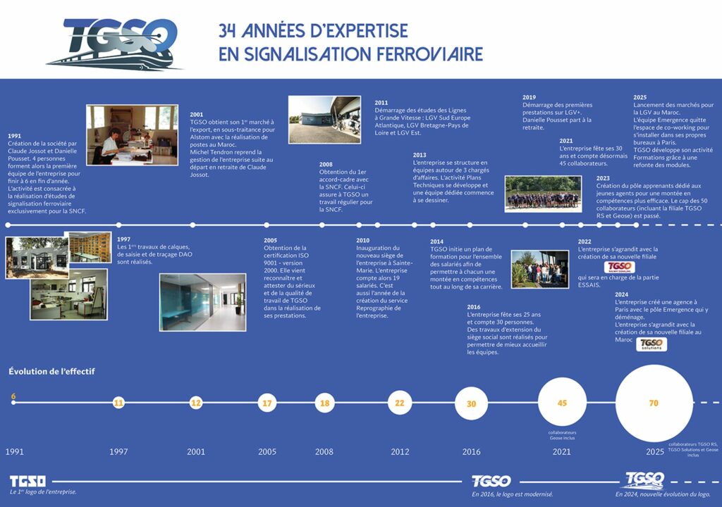 1991 : Création de la société par Claude Jossot et Danielle Pousset. 4 personnes forment l’équipe de départ. L’activité est consacrée à la réalisation d’études de signalisation ferroviaire pour la SNCF exclusivement.